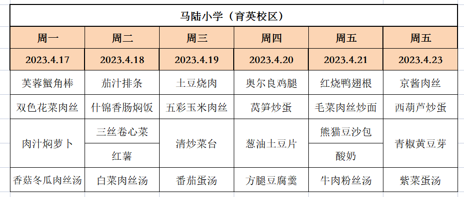 马陆小学学生一周菜单2023年4月17日---2023年4月21日