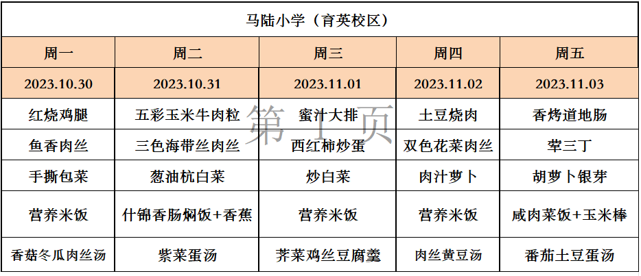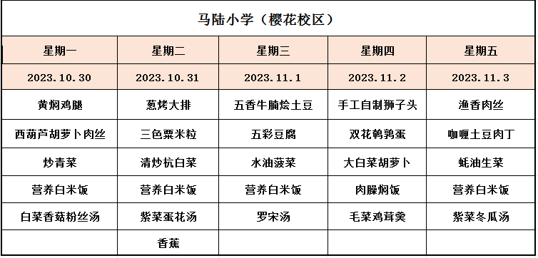 马陆小学一周菜单2023年10月30--2023年11月3