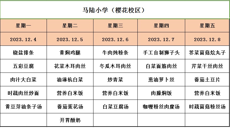 马陆小学一周菜单2023年12月4日--2023年12月8日