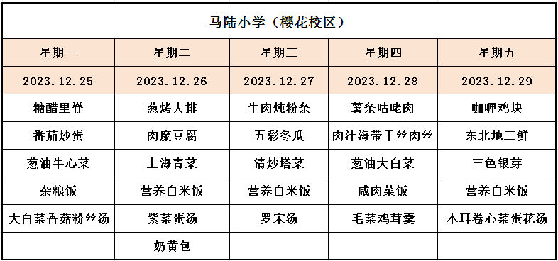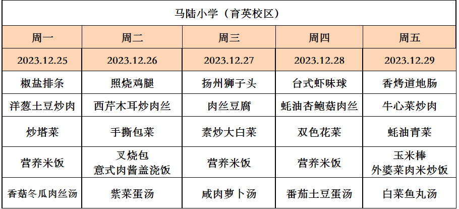 马陆小学一周菜单2023年12月25日--2023年12月29日